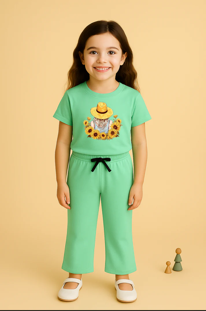 Buy fashionable and comfortable outfits designed for little trendsetters. The Beauty Flower Tracksuit For Girls features a cute, printed top and matching bell-bottom trousers, perfect for informal wear, outings, or as a gift.